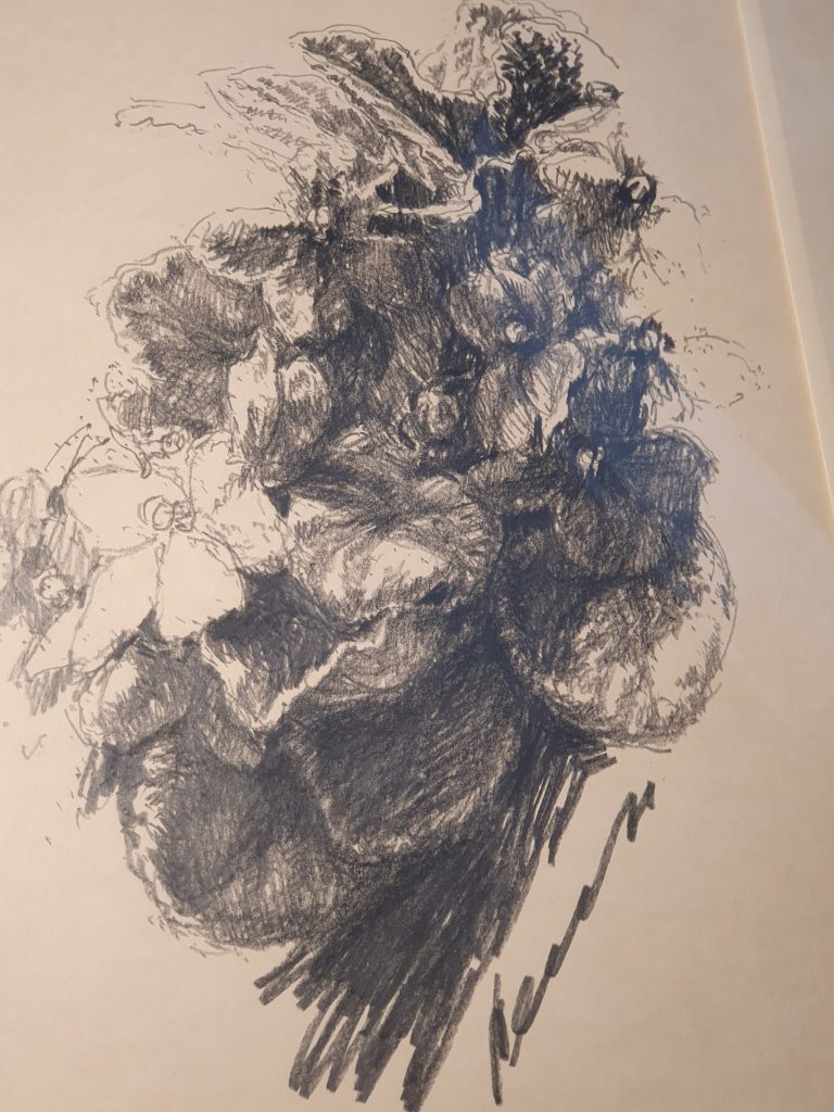 Kresba tuší pod sklem. Kytice ? Velká signatura, dole stranou motivu. Celkový rozměr včetně rámu 34 x 24 cm. Výřez pasparty 22,5 x 33 cm. Vše viz foto. Původní stav. Nerozebíráno, nečištěno.
