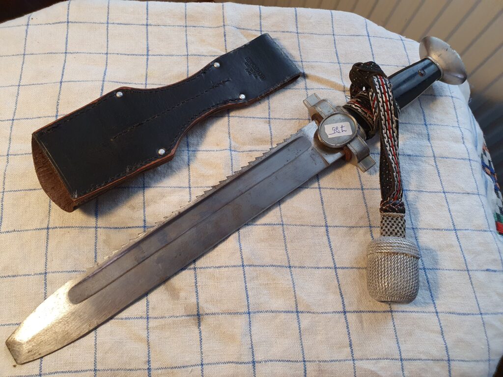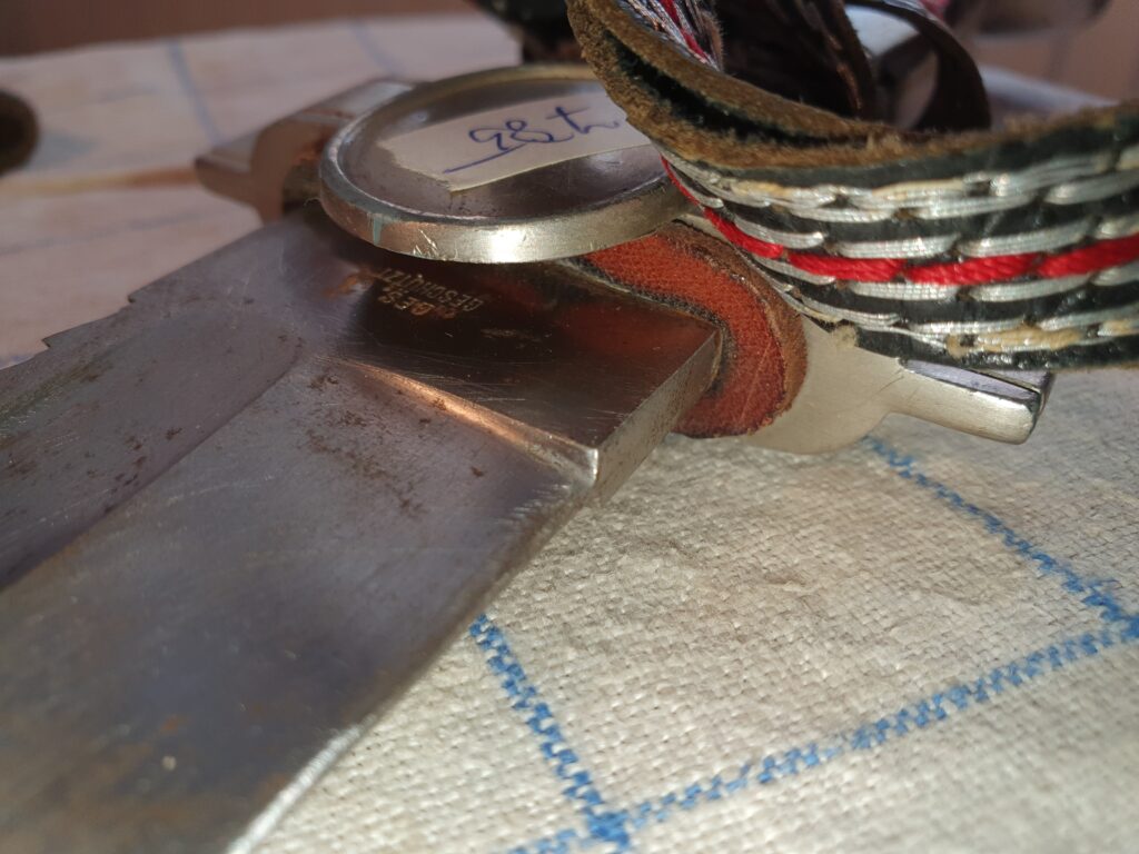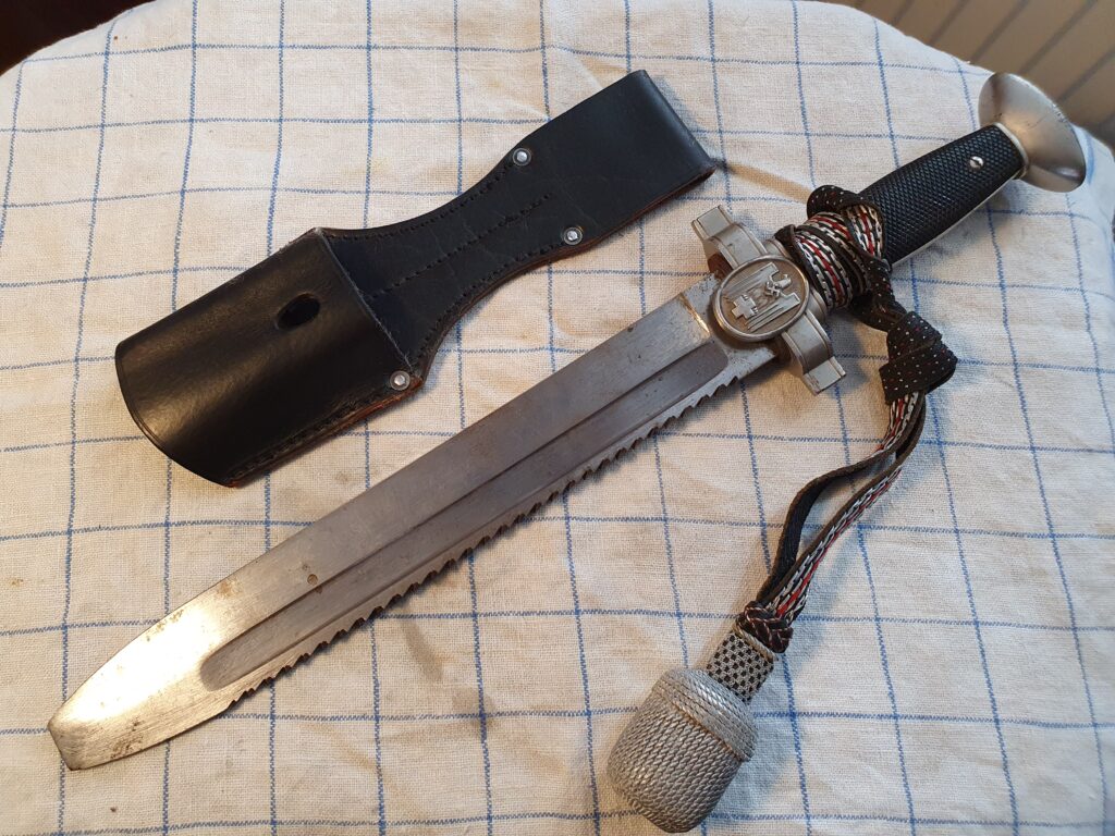 Pouze pro sběratelské účely, bez jakékoliv propagace kteréhokoliv hnutí a spolků, které potlačují nebo by chtěli potlačovat nebo omezovat práva a svobodné zájmy kteréhokoliv člověka – nabízíme k prodeji D.R.K. tesák originál se svastikou pro příslušníky německého červeného kříže r. 1938 – 1945, pod záštitou značen GES CHUTZT. Velice hezký stav bez vady včetně střapce. Závěsník je pravděpodobně replika a bude přidán k předmětu prodeje. Vše viz foto.